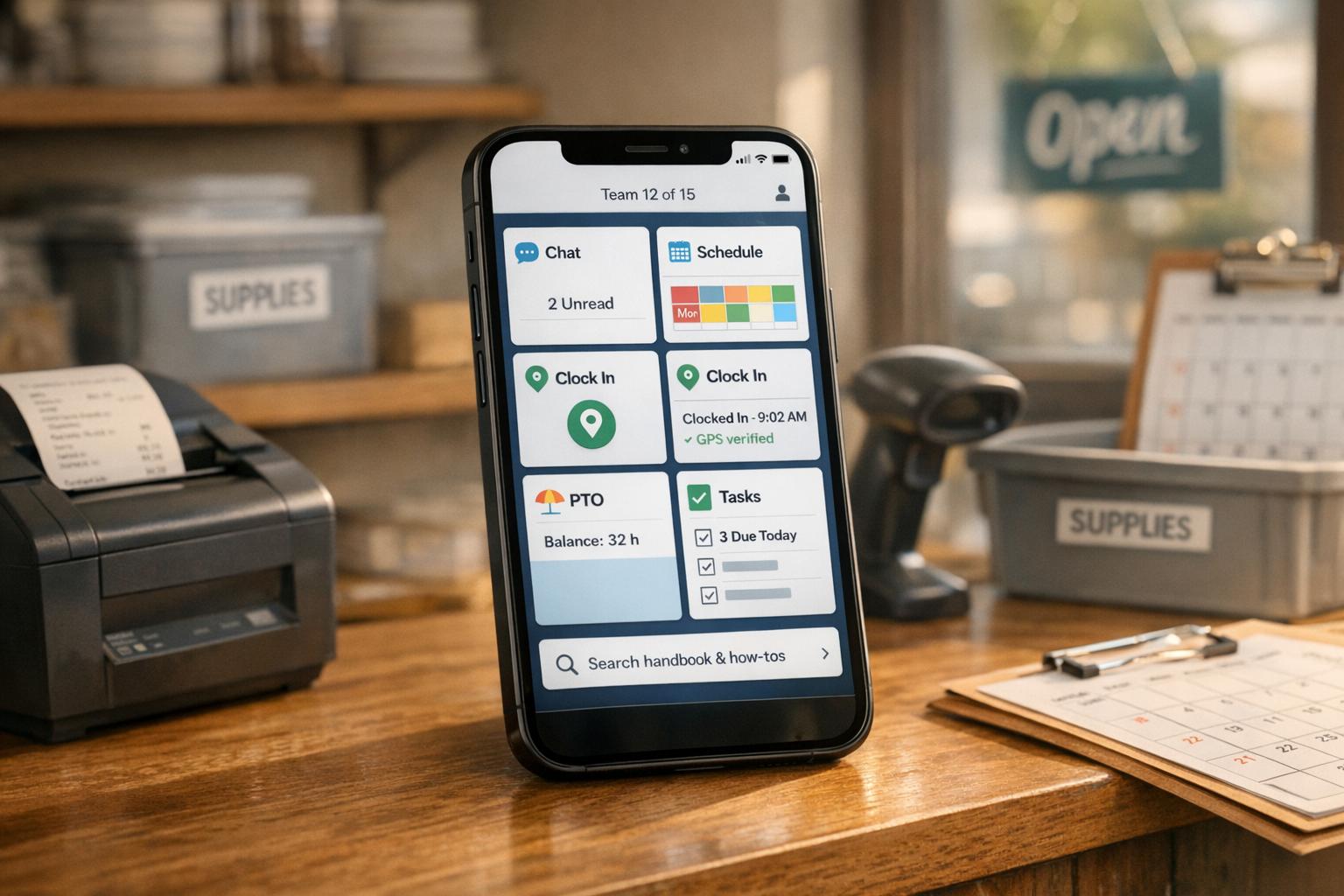 Free app for teams up to 15 with chat, scheduling, GPS clock-in, PTO, tasks, and a searchable knowledge base to simplify small business operations.
